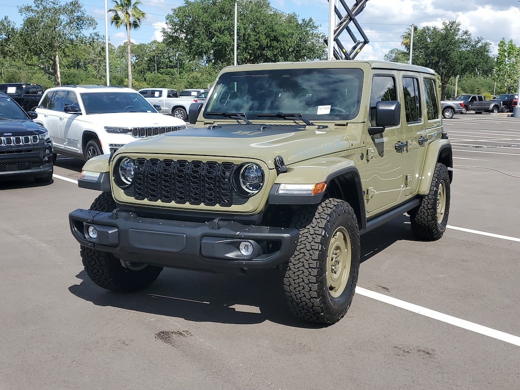 This Vehicle comes equipped with: Convenience Group (2-Door Passive Entry, Front Door Locks, Air Conditioning with Auto Temp Control, Air Filtering, Cluster 7.0" TFT Color Display, Emergency/Assistance Call, Heated Front Seats, Heated Steering Wheel, and Universal Garage Door Opener), Quick Order Package 24H Willys 41 (4WD Willys '41 Swing Gate Decal, 7 and 4 Pin Wiring Harness, 97 MPH Vehicle Max Speed Calibration, Adaptive Cruise Control with Stop, Advanced Brake Assist, Automatic Headlamps, Auxiliary Switches, Body Color Grille with Gloss Black Rings, Body Color Rubicon Highline Flare, Class II Receiver Hitch, Cloth Low-Back Bucket Seats, Conventional Differential Front Axle, Corning Gorilla Glass, Dana M210 Wide HD Tube Front Axle, Dana M220 Wide Rear Axle, Daytime Running Lamps LED Accents, Deep Tint Sunscreen Windows, Front LED Fog Lamps, Full Speed Forward Collision Warning Plus, LED Premium Reflector Headlamps, MOPAR All-Weather Floor Mats, Off-Road Plus Mode, Power Heated Mirrors, Premium Tan Sunrider Soft Top, Premium Wrapped Steering Wheel, Security Alarm, Steel Front Bumper, Steel Rear Bumper, Sun Visors with Illuminated Vanity Mirrors, Wheels: 17" x 7.5" Fully Painted, Willys '41 Retro Edition Buzz Model, Willys '41 Retro Edition Hood Decal, Willys '41 Retro Edition Tailgate Plaque, Willys '41 Retro Edition Wrangler Decal, Willys '41 Retro Shift Bezel Insert, and Willys '41 US Edition U.S. Hood Decal), Safety Group (Auto High Beam Headlamp Control, Blind Spot and Cross Path Detection, Injection Molded Black Rear Bumper, LED Taillamps, and ParkSense Rear Park Assist System), Steel Power Dome Hood Package (Power Dome Dual Vented Hood), 12.3" Touchscreen Display, 4-Wheel Disc Brakes, 4G LTE Wi-Fi Hot Spot, 8 Speakers, ABS brakes, Air Conditioning, AM/FM radio: SiriusXM with 360L, Apple CarPlay, Apple CarPlay/Android Auto, Aux Battery, Body Color 3-Piece Hard Top, Brake assist, Compass, Connectivity - US/Canada, Delay-off headlights, Driver door bin, Driver vanity mirror, Dual front impact airbags, Dual front side impact airbags, Electronic Stability Control, For More Info, Call 800-643-2112, Freedom Panel Storage Bag, Front anti-roll bar, Front Bucket Seats, Front Center Armrest w/Storage, Front fog lights, Front reading lights, Google Android Auto, Illuminated entry, Integrated Center Stack Radio, Integrated roll-over protection, Low tire pressure warning, Manufacture Statement of Origin, Myflexcare Service Plan, No Soft Top, Non-Lock Fuel Cap Without Discriminator, Normal Duty Suspension, Occupant sensing airbag, Outside temperature display, Overhead airbag, Panic alarm, ParkView Rear Back-Up Camera, Passenger door bin, Passenger vanity mirror, Power steering, Power windows, Radio data system, Radio: Uconnect 5 with 12.3" Display, Rear anti-roll bar, Rear reading lights, Rear Window Defroster, Rear Window Wiper/Washer, Remote keyless entry, SiriusXM Radio Service, SiriusXM with 360L, Speed control, Split folding rear seat, Steering wheel mounted audio controls, Stop-Start Dual Battery System, Tachometer, Telescoping steering wheel, Tilt steering wheel, Traction control, Trip computer, Variably intermittent wipers, and Wheels: 17" x 7.5" Black Steel Styled.